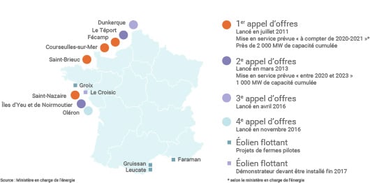 S’il est beaucoup question de l’éolien offshore depuis plusieurs années, aucun parc n’est encore en service en France à ce jour. Quatre appels d’offres dédiés ont été lancés en juillet 2011, mars 2013, avril 2016 et novembre 2016 et les premières mises en service de parcs sont attendues à l’horizon 2020. Ségolène Royal vient d’annoncer que les autorisations administratives du futur parc éolien offshore de Saint-Brieuc qui fait l’objet du 3e appel d’offres seraient délivrées « dans les prochains jours ». Des études techniques (conditions météo-océaniques, sédimentologie, bathymétrie, etc.) doivent débuter en avril 2017 sur la zone d’Oléron qui a été retenue pour le 4e appel d’offres.