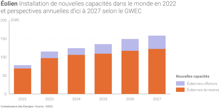 En 2022, 77,6 GW de capacités éoliennes ont été installées dans le monde, soit « le plus bas niveau des 3 dernières années » mais tout de même « la 3e année record » dans l'histoire de la filière, indique le GWEC.