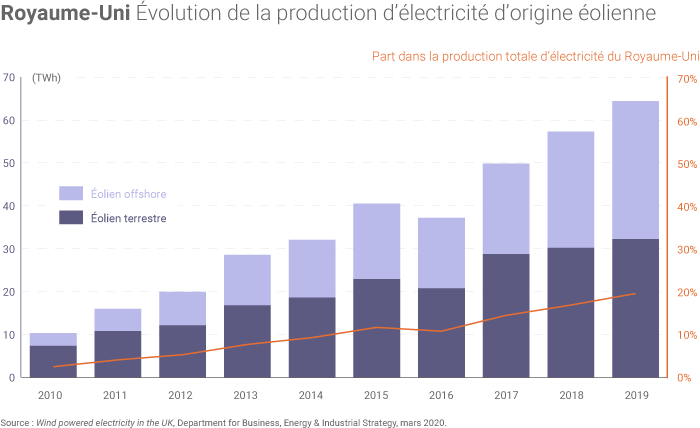 Au 1er trimestre 2020, la production éolienne offshore au Royaume-Uni était supérieure de 53% au niveau du 1er trimestre 2019, grâce à des conditions de vents favorables et à l'augmentation des capacités installées(13).