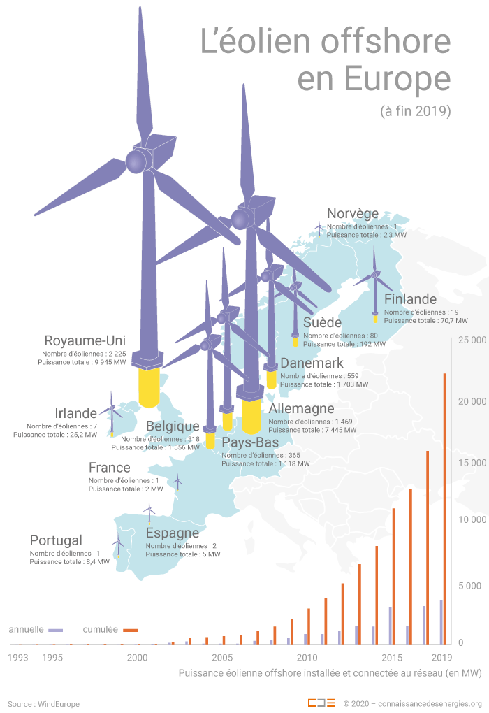 Plus de 44% des éoliennes offshore installées en Europe à fin 2019 étaient implantées dans les eaux britanniques. (©Connaissance des Énergies, d'après WindEurope)