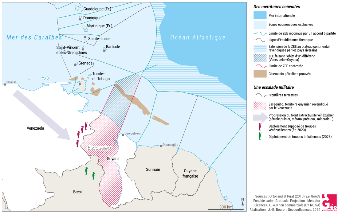 Carte issue de l'article « Essequibo : crise géopolitique entre le Guyana et le Venezuela » de Patrick Blancodini paru sur Géoconfluences. Cliquez dessus pour une meilleure définition.