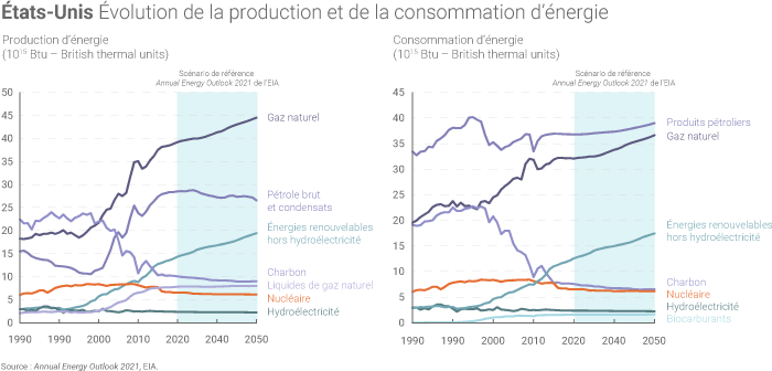En 2020, le pétrole et le gaz naturel ont compté pour environ 70% de la consommation d'énergie primaire des États-Unis. Selon l'EIA (Energy Information Administration), cette part pourrait être quasiment similaire en 2050 (la part des énergies renouvelables hors hydroélectricité dans le mix énergétique américain pourrait quant à elle progresser de 8% en 2020 à 17,5% en 2050(1)).
