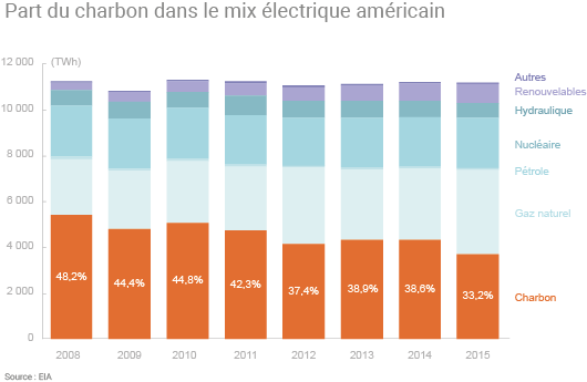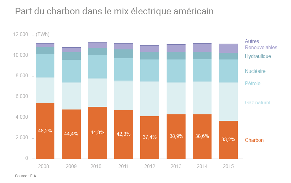 Aux États-Unis, le charbon ne comptait plus en 2015 que pour 17,4% de la consommation d’énergie primaire(2) et pour un tiers de la production électrique. L’industrie américaine du charbon a en effet connu un fort ralentissement depuis 2008, principalement dû à la révolution du gaz de schiste mais aussi à la baisse de la demande chinoise et aux politiques environnementales pénalisant ses fortes émissions de gaz à effet de serre.