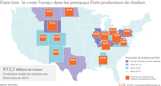 Notons que Donald Trump a connu un succès particulier dans les différents États charbonniers, bien que de nombreux autres facteurs interviennent dans le vote des électeurs américains. Le nouveau Président a ainsi réalisé ses scores les plus importants dans le Wyoming et la Virginie de l’Ouest qui sont les deux principaux États producteurs de charbon (plus de la moitié de la production américaine à eux deux).
