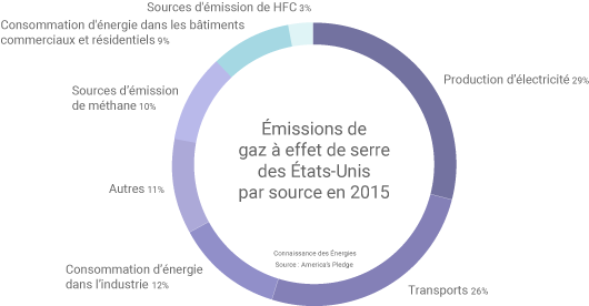 Selon l'initiative America's Pledge, près de 55% des émissions américaines de gaz à effet de serre sont imputables à la production d'électricité et aux transports. (©Connaissance des Énergies, d’après EIA)