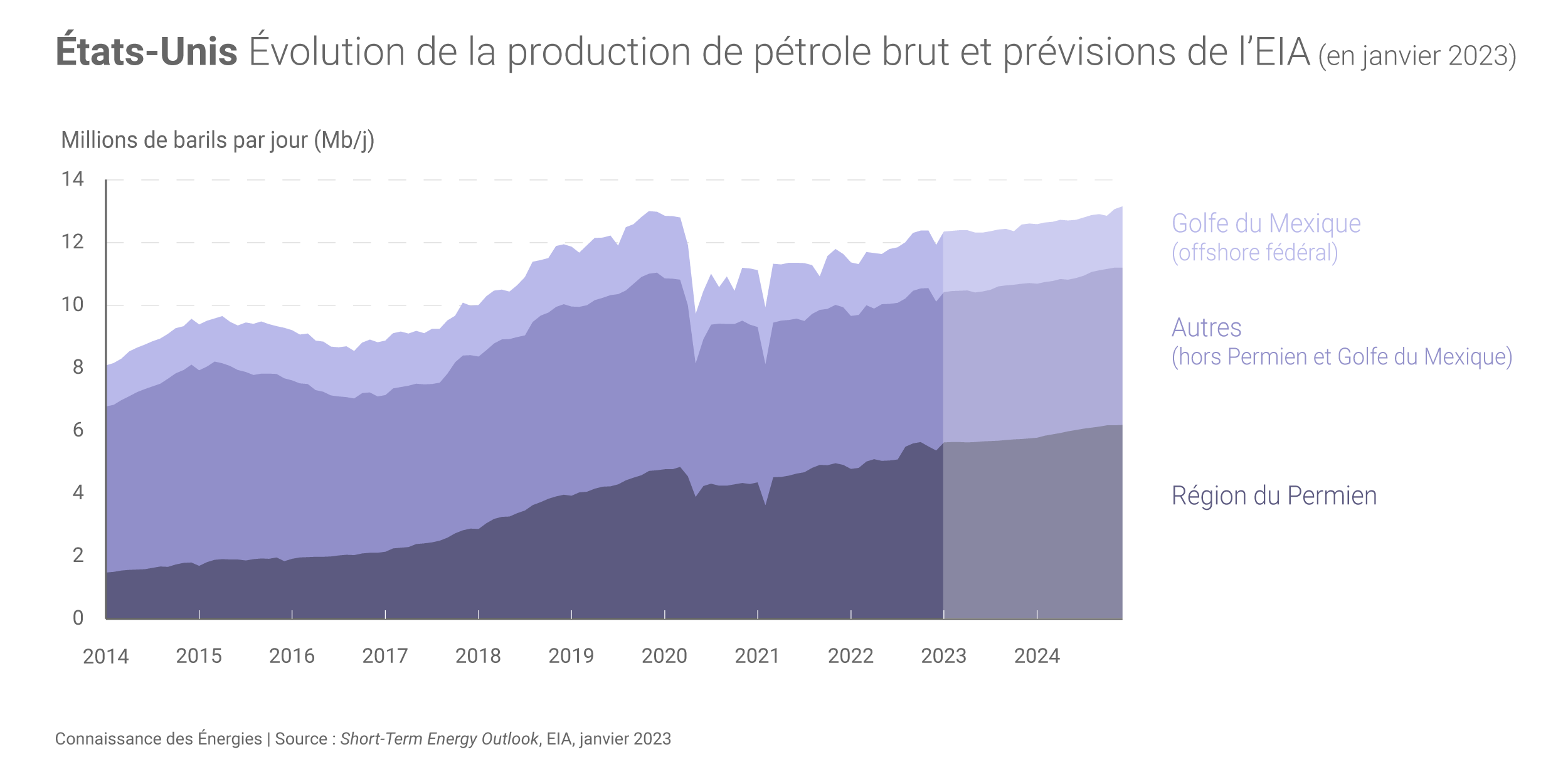 Cette future hausse proviendra essentiellement de l'augmentation de la production dans la région du Permien, zone phare du développement des hydrocarbures de schiste, située à l’ouest du Texas et au sud-est du Nouveau-Mexique (où la production de pétrole brut pourrait s'élever à 5,7 Mb/j en 2023) et, « dans une moindre mesure », du golfe du Mexique, précise l'EIA.