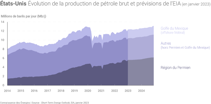 Cette future hausse proviendra essentiellement de l'augmentation de la production dans la région du Permien, zone phare du développement des hydrocarbures de schiste, située à l’ouest du Texas et au sud-est du Nouveau-Mexique (où la production de pétrole brut pourrait s'élever à 5,7 Mb/j en 2023) et, « dans une moindre mesure », du golfe du Mexique, précise l'EIA.