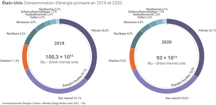 En 2020, la consommation d’énergie primaire des États-Unis a baissé de 7,3% par rapport à 2019(2), soit une chute bien plus forte que la moyenne mondiale (baisse de presque 4%). La consommation américaine de pétrole a en particulier baissé de 12,6%, la crise sanitaire ayant particulièrement affecté le secteur des transports.