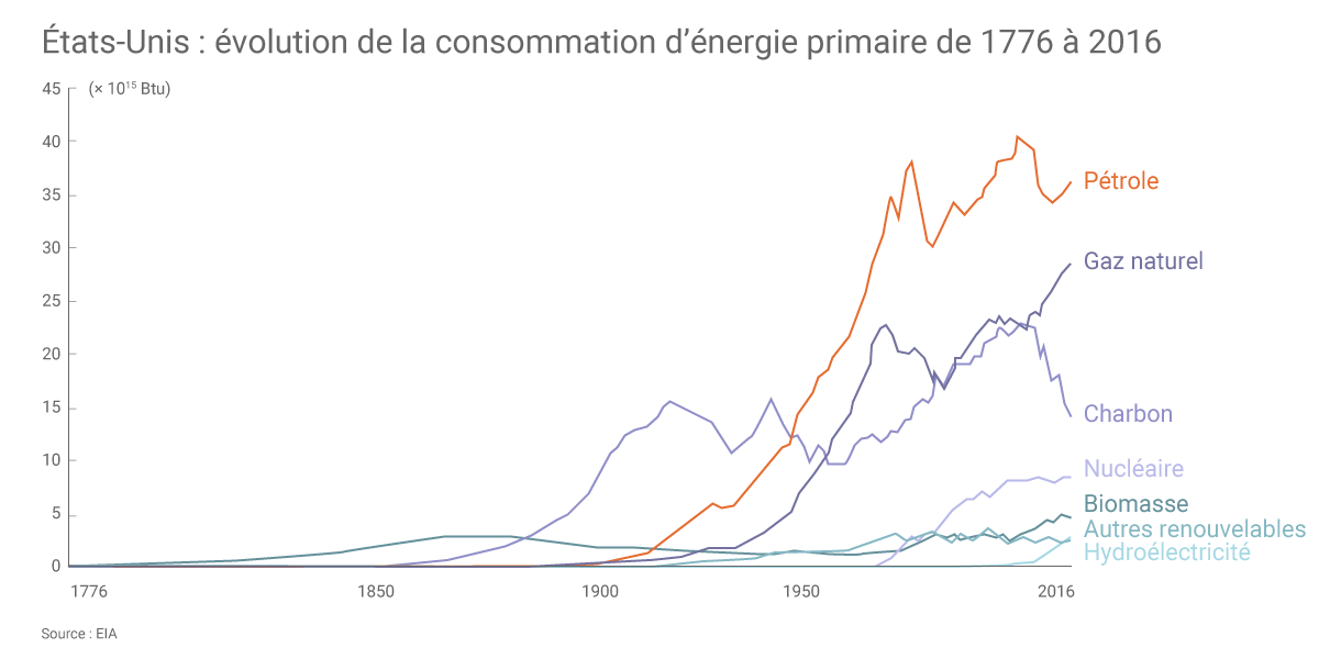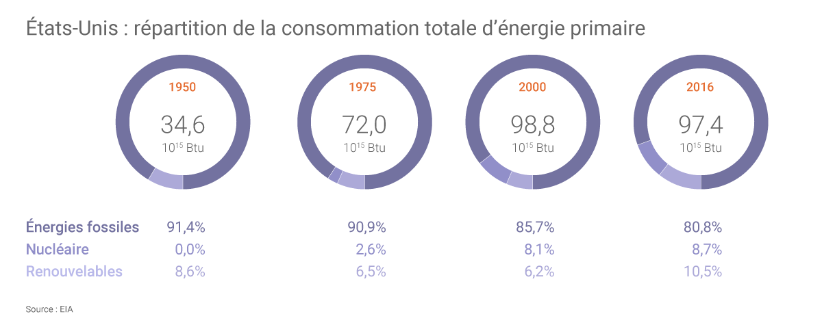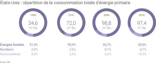 Jusqu’aux environs de 1885, c’est la biomasse qui constituait la principale source d’énergie des États-Unis. Au bois combustible s’est ensuite substitué le charbon, symbole de la révolution industrielle et du développement des chemins de fer. Depuis le milieu du XXe siècle, le pétrole constitue la principale source d’énergie du mix américain : il a compté pour 36,9% de la consommation d’énergie primaire du pays en 2016. Précisons que les États-Unis ont commencé à importer du pétrole dès 1949 et que ces importations ont fortement augmenté au cours des décennies suivantes (de 10% de la consommation américaine en 1949 à 50% trente ans plus tard).