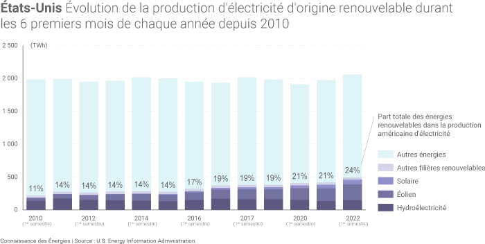 Au cours des 6 premiers mois de l'année 2022, la production américaine d'électricité provenant d'installations dites « utility scale » (centrales d'au moins 1 MW de puissance) s'est élevée à 2 060 TWh(1) selon l'EIA (Energy Information Administration). Les énergies renouvelables ont compté pour un peu plus de 24% de ce total (avec 498 TWh au 1er semestre 2022), contre environ 21% sur la même période en 2020 et 2021. Ce sont les filières productrices d'électricité connaissant la croissance la plus rapide aux États-Unis.