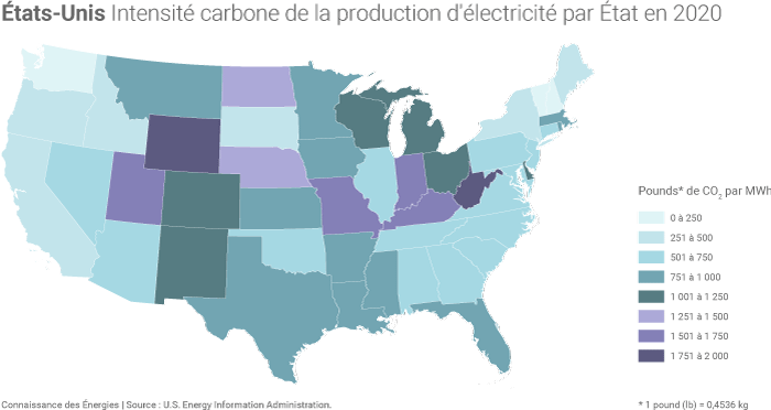 Au total, l'intensité carbone moyenne de la production américaine d'électricité en 2020 avoisinait 854 pounds de CO2 par MWh, soit environ 387 g de CO2 par kWh, ce qui équivaut à environ 7 fois plus que l'intensité carbone de la production française d'électricité.