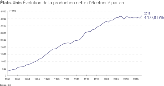 En 2018, le parc électrique américain a généré 4% d’électricité de plus qu’en 2017 et davantage que son pic historique de production de 2007 (4 157 TWh) selon l’EIA. Cette hausse est liée à la croissance de la demande que l'EIA explique principalement par les conditions météorologiques – « des hivers froids (en début et fin d’année) et un été chaud » – qui ont fait fortement augmenter la demande d’électricité dans les bâtiments résidentiels et tertiaires en 2018.