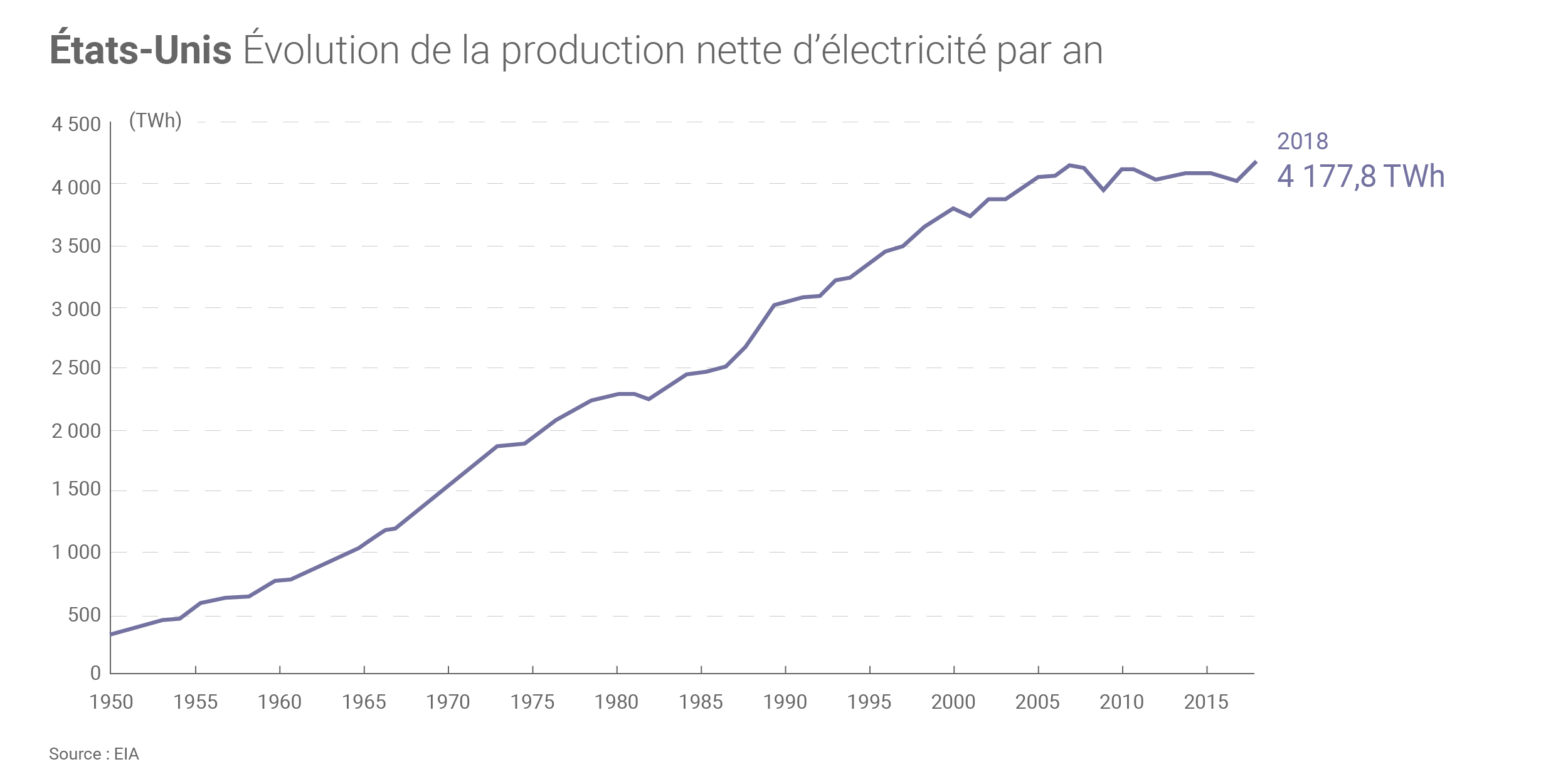 À titre de comparaison, la production nette d’électricité en France métropolitaine a atteint 548,6 TWh en 2018 selon les dernières données de RTE. La production américaine était ainsi 7,6 fois plus élevée que la production française l’an dernier (avec une population 4,9 fois plus élevée).