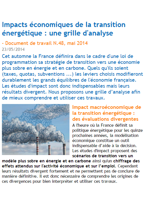 Une loi de programmation de la transition énergétique doit être présentée aux parlementaires français d’ici à l’été 2014. Elle entraînera la mise en œuvre d’un certain nombre de mesures qui restent à préciser, par exemple une possible taxation des émissions de carbone. De nombreuses études d’impacts sur cette transition et ses outils ont été publiées jusqu’ici mais celles-ci aboutissent à des conclusions très variables, y compris lorsqu’elles partent des mêmes hypothèses.