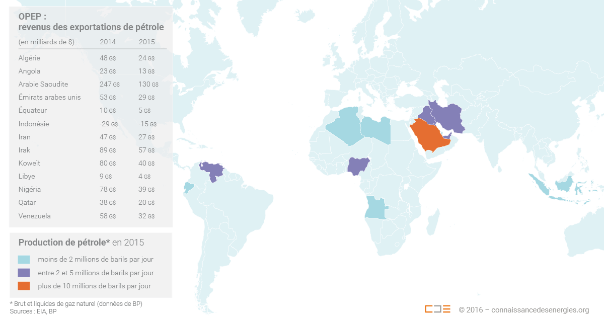 En 2015, les pays membres de l’OPEP auraient tiré près de 404 milliards de dollars de leurs exportations de pétrole(2). C’est 46% de moins qu’en 2014 (753 milliards de dollars), principalement en raison de la chute des cours et, dans une moindre mesure, à cause des plus faibles exportations de pétrole desdits pays selon l’EIA américaine.