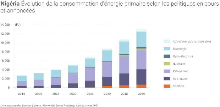 L'Irena y alerte sur les évolutions énergétiques à venir dans un scénario « tendanciel » (sur la base des politiques en cours ou annoncées) : la consommation d'énergie primaire du Nigéria pourrait approximativement quadrupler dans les 3 décennies à venir et la part des énergies renouvelables dans le mix énergétique nigérian pourrait chuter à 33% à l'horizon 2050(2), contre plus de 63% pour les énergies fossiles. Les émissions de CO2 liées au secteur énergétique pourraient quant à elles s'élever à 516 millions de tonnes à l'horizon 2050, contre 119 Mt en 2015.