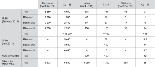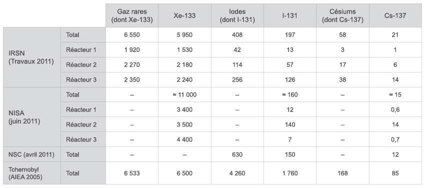 Estimations des activités (x 1015 Bq) des principales catégories de radionucléides rejetés lors de l'accident de Fukushima
