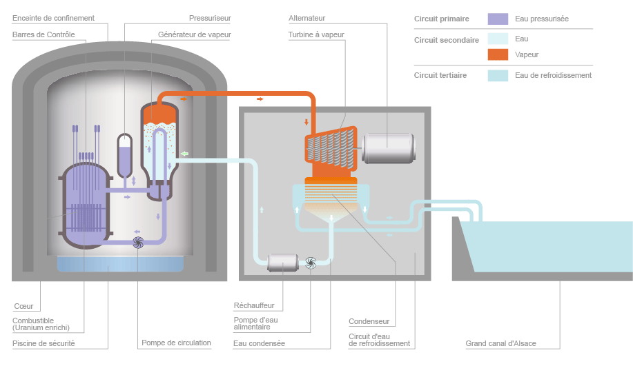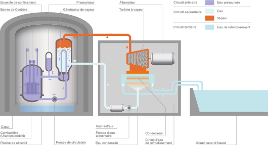 Concrètement, des assemblages de combustible (uranium enrichi en U235) sont insérés dans le cœur de chaque réacteur, chacun étant immergé dans une cuve d’eau. La réaction de fission en chaîne au sein du combustible dégage de la chaleur qui est transmise à l’eau environnante. Cette eau, dite « primaire », ne bout pas car elle est maintenue sous forte pression (155 bar).