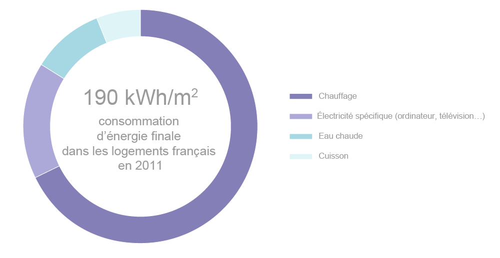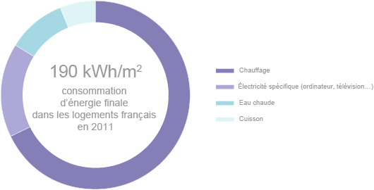 - La consommation moyenne d’énergie finale par logement atteint en France 190 kWh/m2 en 2011 (contre 240 kWh/m2 en 1990).