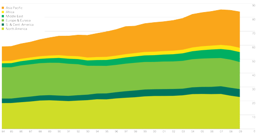 Consommation de pétrole par région en millions de barils par jour (©BP Statistical Review of World Energy June 2010) : La consommation mondiale de pétrole a chuté de 1,2 millions de barils par jour. Il s’agit d’une deuxième baisse consécutive et comme pour la production de pétrole, la plus forte baisse depuis 1982.