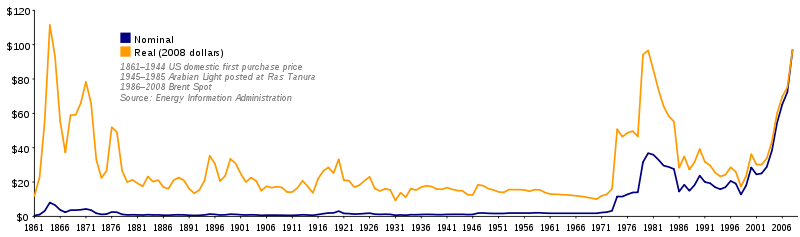 - Si l’on compare les prix du pétrole entre deux années différentes, l’inflation doit être prise en compte. A titre d’exemple, le prix « courant » du baril en 1979 est d’environ 35 dollars, en revanche si l’on tient compte de l’inflation, son prix « constant » en dollars de 2009 est de 90 dollars.