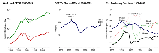 Evolution de la production de pétrole de 1960 à 2009 (© US Energy Information Administration / Annual Energy Review 2009)