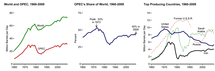 En parallèle à cette augmentation de la demande mondiale, l'Organisation des Pays Exportateurs de Pétrole (OPEP) formée en 1960 se réunit en 1970 et 1971 afin de revaloriser le prix du pétrole. L’union de ces grands pays producteurs au sein d’un cartel accroît considérablement leur pouvoir de marché sur la fixation des quantités mises en vente ainsi que sur le prix du baril.