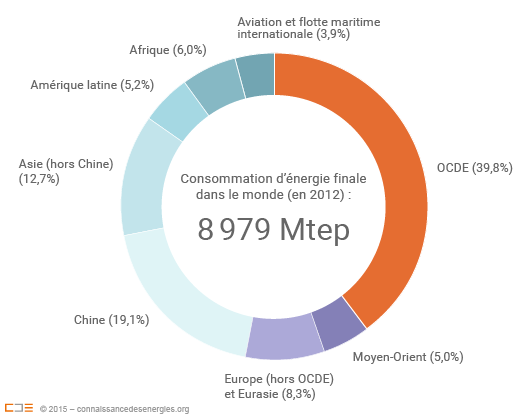 La consommation d'énergie finale dans le monde en 2012 avoisine 9 milliards de tonnes d’équivalent pétrole (d'après Key World Energy Statistics 2014, AIE)