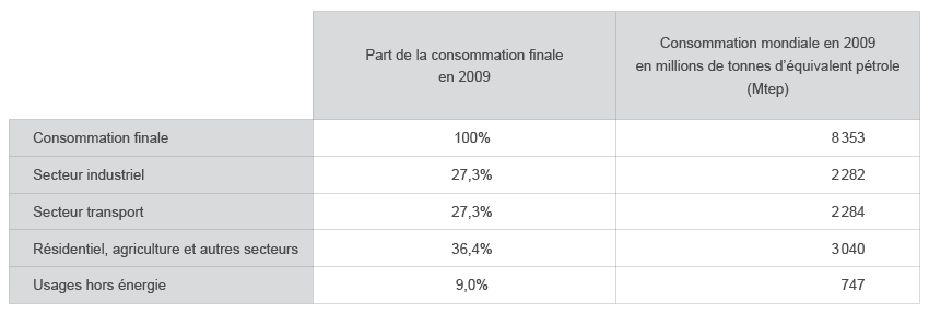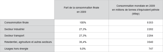 | Part de la consommation finale en 2012 | Consommation mondiale en 2012 en millions de tonnes d'équivalent pétrole (Mtep) | |