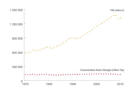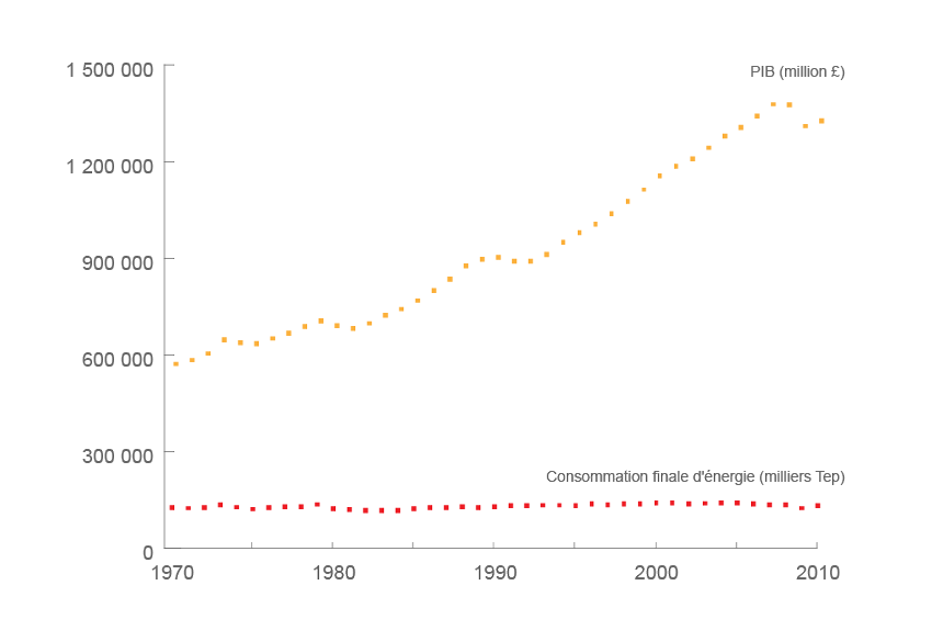 Evolution de la consommation finale et du PIB au Royaume-Uni (©Connaissance des Énergies, d'après données du Departement of Energy, juillet 2010)