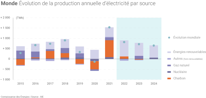 L’Agence internationale de l’énergie indique que « ses perspectives pour 2022 à 2024 esquissent un tableau assez différente de celui observé en 2021 » : elle attend une hausse moyenne de 8% par an de la production des filières renouvelables qui devraient être à l’origine d’une « large majorité de la hausse de la production dans les années à venir ». Ces filières pourraient compter pour 32% de la production mondiale d’électricité en 2024 selon l’AIE (contre 58% pour les énergies fossiles et toujours près de 10% pour le nucléaire).