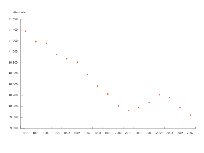 Afin de mieux mettre en évidence le comportement de consommation d’énergie finale des pays ou groupes de pays et leur tendance longue, les économètres se réfèrent à « l’intensité énergétique » exprimée en unités d’énergie consommée par unité monétaire de PIB, donc de production intérieure au pays.