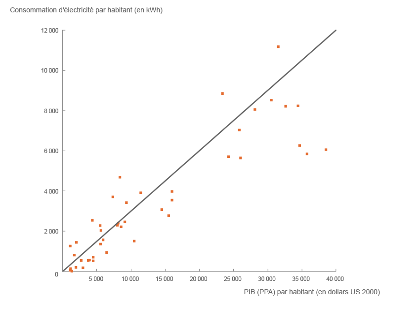 Consommation annuelle d'électricité en fonction du PIB à parité de pouvoir d'achat par habitant en 2008 (d'après données AIE)