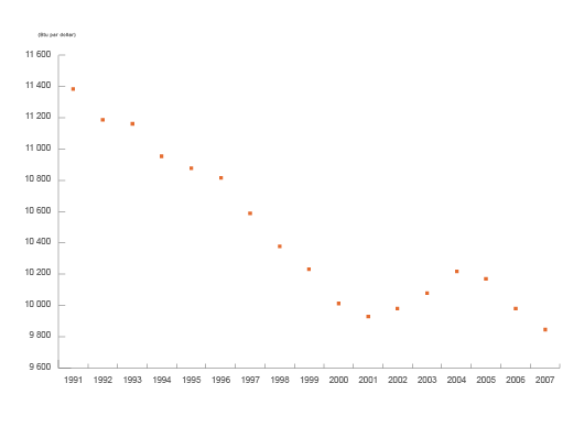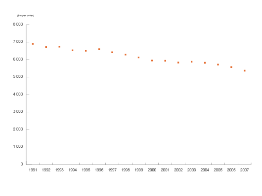 Intensité énergétique pour le monde en unités d’énergie consommées par $ US de PIB (©Connaissance des Énergies, d'après source : Energy Independant Agency)