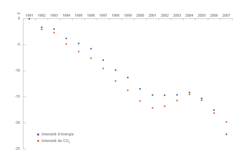 Le graphique suivant montre ainsi le parallèlisme des gains en % par rapport à 1991 de l’intensité énergétique et de l’intensité CO2 : les différences entre les deux courbes montrent qu’elles décrivent fondamentalement la même tendance ; les questions de l’efficacité énergétique et du contrôle de l’émission de CO2 se sont confondues lors des 2 dernières décennies.