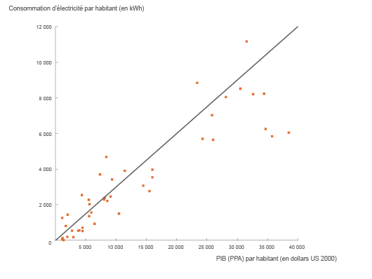 Dans les pays pauvres, la relation entre consommation et PIB est controversée et pourrait être due à la mauvaise connaissance des consommations exactes. En particulier dans les pays sans accès à l’électricité, la principale source d’énergie résidentielle reste la consommation de biomasse (bois, déjections et déchets) qui échappe au comptage.