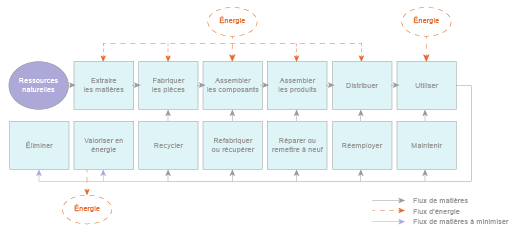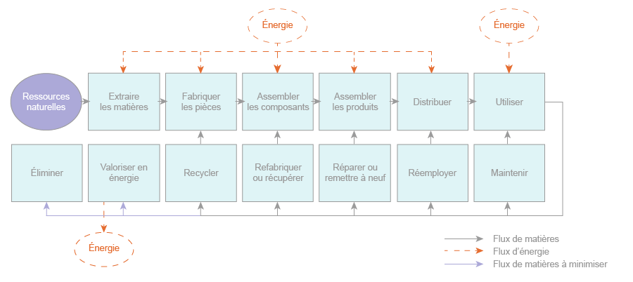 L’économie circulaire se définit en opposition au concept d’économie linéaire dominant, caractérisé par la formule « extraire-fabriquer-jeter » sans préoccupations relatives à la raréfaction des ressources et à la production de déchets. L’économie circulaire ne doit cependant pas être limitée au bouclage des flux et à la valorisation des déchets.