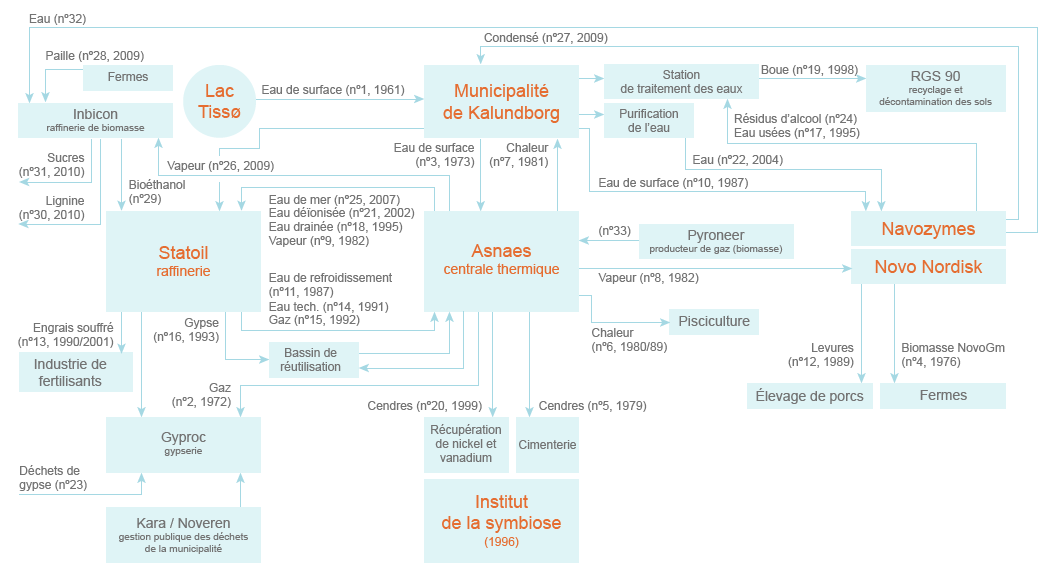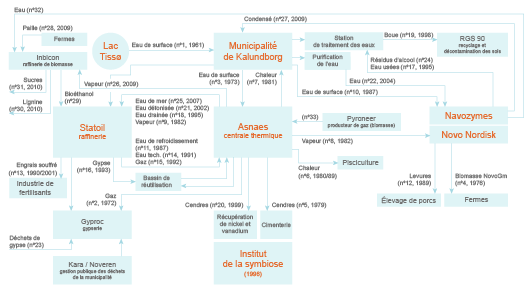 Schéma de la symbiose industrielle, état en 2010. Légende flux : rang chronologique, nature du flux, année de mise en place (©D'après Christensen, 2010)