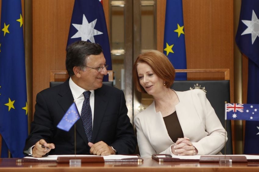 C'est le président de la Commission européenne (ici l'ancien président Jose Manuel Barroso avec la première ministre australienne Julia Gillard en septembre 2011) qui signe les différents « accords Euratom ». (©Union européenne)