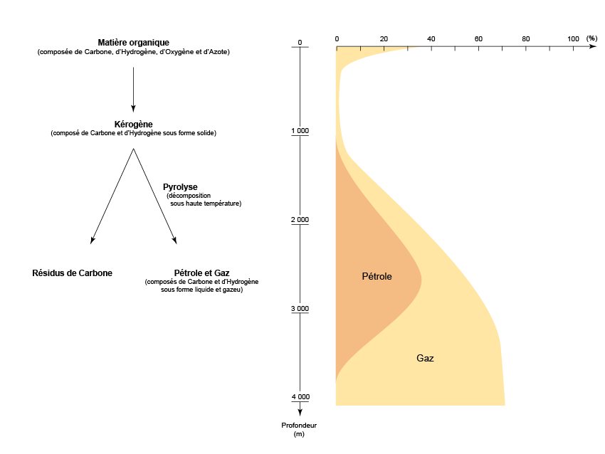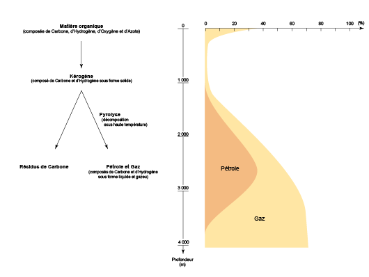 - entre 60° et 120°C (entre 2 000 à 3 000 mètres de profondeur), le kérogène produit principalement du pétrole et une faible quantité de gaz ;