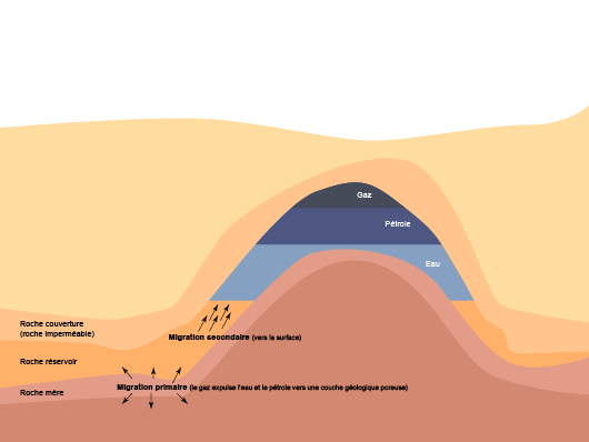 De faible densité, le pétrole expulsé (mélangé à de l’eau et du gaz dissous) a tendance à remonter jusqu’à la surface de la Terre. Il s’échappe très lentement à travers les couches sédimentaires perméables qui jouxtent la roche-mère :