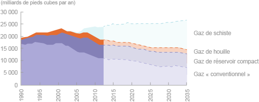 Données sur la production américaine de gaz de houille en milliards de pieds cubes, sachant que 1m3= 35,3 cf (« cubic feet »)