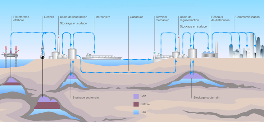 Avant d’être dirigé vers le consommateur final, le gaz naturel transite vers des sites de stockage installés près des gisements ou des zones de consommation. Deux types de stockage existent :