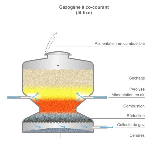 À co-courant, les différentes étapes de la réaction de gazéification sont successivement réalisées de haut en bas dans le réacteur. La matière organique est d’abord introduite à son sommet. De l’air est injecté à mi-hauteur pour amorcer la combustion et fournir de la chaleur à l’ensemble du réacteur. L’augmentation progressive de la température permet d’obtenir les différentes réactions entrainant les gaz produits vers la zone la plus chaude du réacteur. Le syngas est récupéré au niveau du socle du gazéificateur.