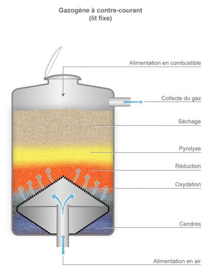 À contre-courant, l’air est injecté à la base du réacteur et le syngas est récupéré sous son sommet, au dessus de la zone de pyrolyse. Les goudrons sont moins nombreux à s’échapper du réacteur et l’encrassement des conduits est donc plus limité.