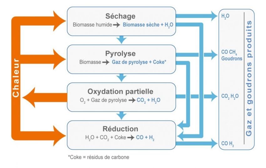Pour parvenir à la production du syngas, plusieurs réactions préalables sont nécessaires. L’ensemble de ce processus est appelé gazéification. Il nécessite, à partir d’une matière organique, d’obtenir au préalable dans le réacteur de la vapeur d’eau (H2O), du carbone (C) et de produire une chaleur suffisante pour la réaction finale de gazéification.