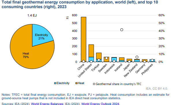En 2023, environ un cinquième de cette énergie d'origine géothermale seulement était consommée sous forme d'électricité, le reste (79%) l'étant directement sous forme de chaleur.