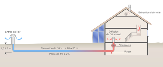 Le puits canadien consiste à faire circuler de l'air de l'extérieur vers l'intérieur de l'habitation, dans une canalisation enterrée à faible profondeur.