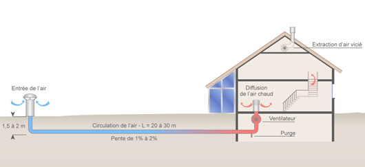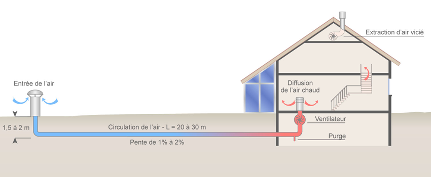 La circulation d’air dans la canalisation peut être passive (en positionnant par exemple l’entrée de la canalisation vers les vents dominants) ou mécanique grâce une ventilation mécanique contrôlée.