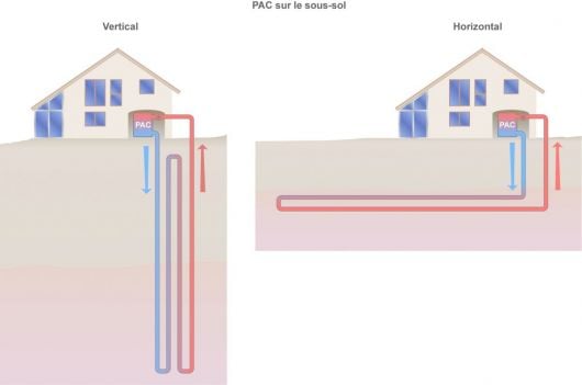 Schéma des pompes à chaleur à capteurs horizontaux et verticaux (©CDE)